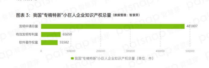 在這些“專精特新”小巨人企業中,專利申請總量48.18萬件,平均單企業專利申請98件;有效發明專利量6.57萬件,平均每家企業有效發明專利量約13件;軟件著作權共5.56萬件,平均每家企業擁有軟件著作權約11件。