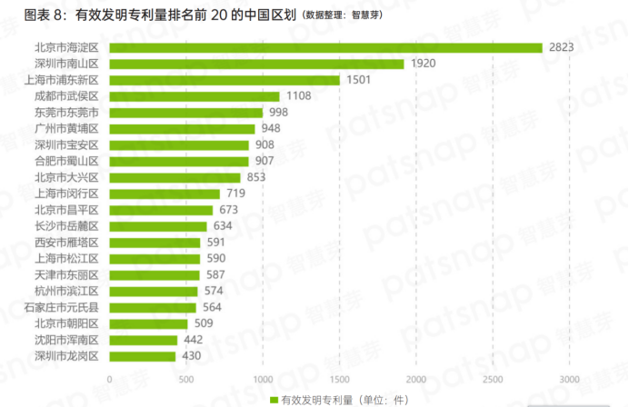 在“專精特新”小巨人企業專利能力的區域分布上,如果將顆粒度進一步細分到區,可以看到有效發明專利量排名前20的分別是,北京市海淀區、深圳市南山區、上海市浦東新區、成都市武侯區、廣東省東莞市、廣州市黃埔區、深圳市寶安區、合肥市蜀山區、北京市大興區和上海市閔行區;11-20名的區域則有北京市昌平區、長沙市岳麓區、西安市雁塔區、上海市松江區、天津市東麗區、杭州市濱江區、石家莊市元氏縣和北京市朝陽區。
