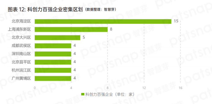 科創力排名前100企業所在行政區中,中國“專精特新”小巨人企業最多的區劃是北京市海淀區,有15家企業上榜,第二是上海市浦東新區,有8家企業上榜,第三是北京市大興區,5家企業上榜。杭州市濱江區、北京市昌平區、廣州市黃埔區、深圳市南山區和成都市武侯區分別有4家企業上榜。