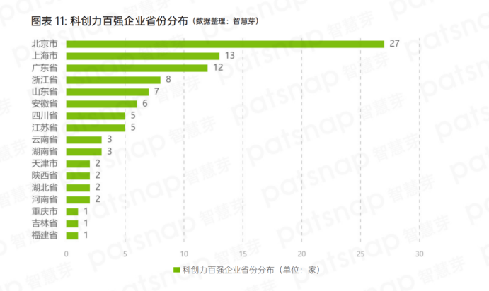 《報告》顯示,科創力排名前100企業的省份分布中,排名前三的省份分別為北京市、上海市和廣東省,分別有27家、13家和12家企業上榜。而浙江省、山東省、安徽省和江蘇省分別有 8、7、6、5 家企業上榜。