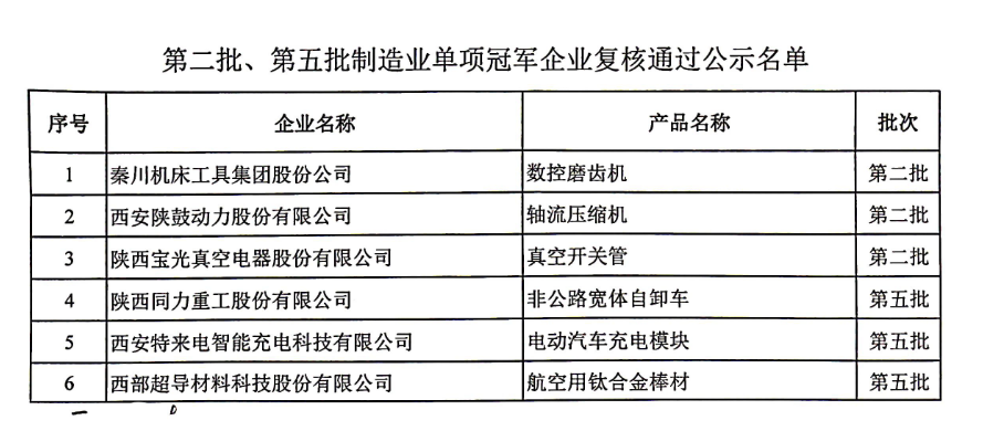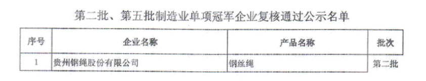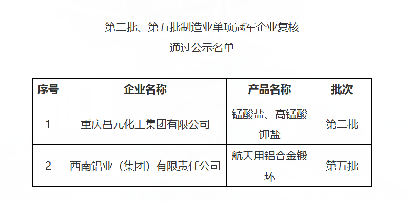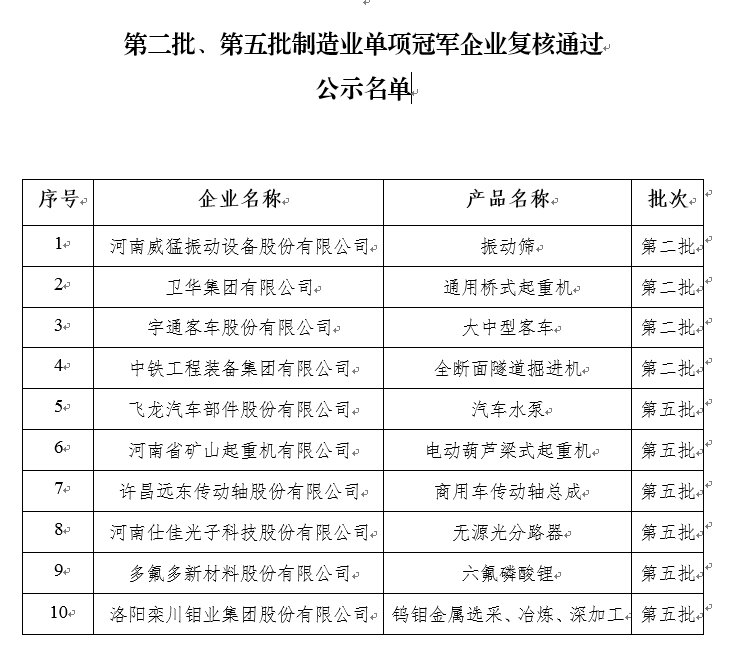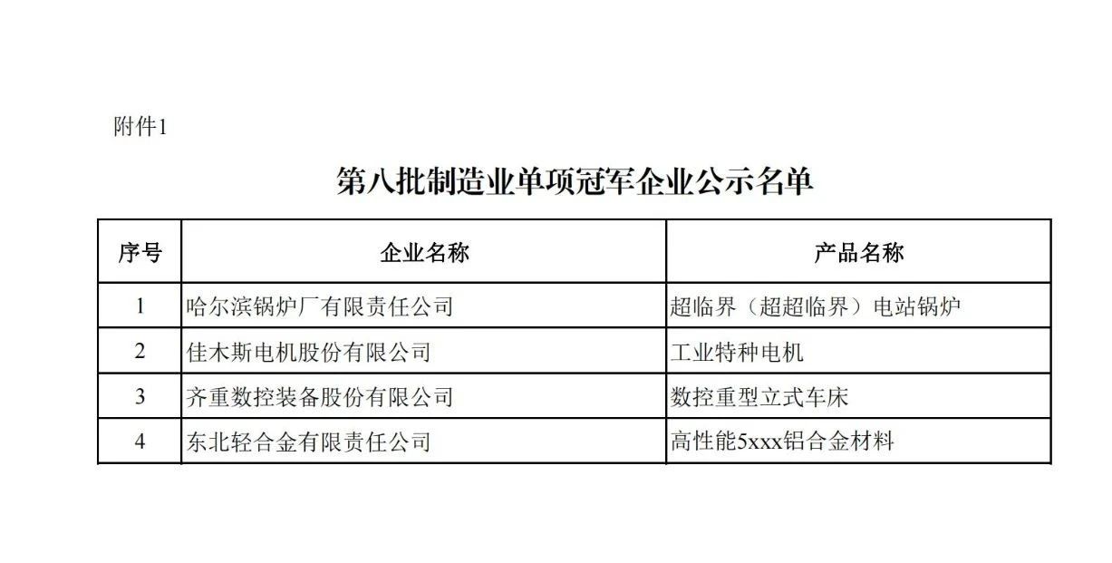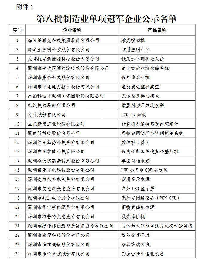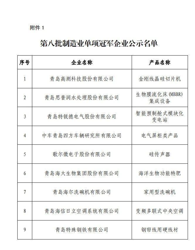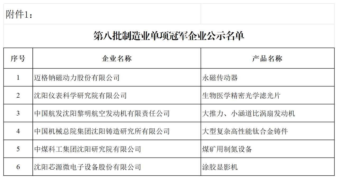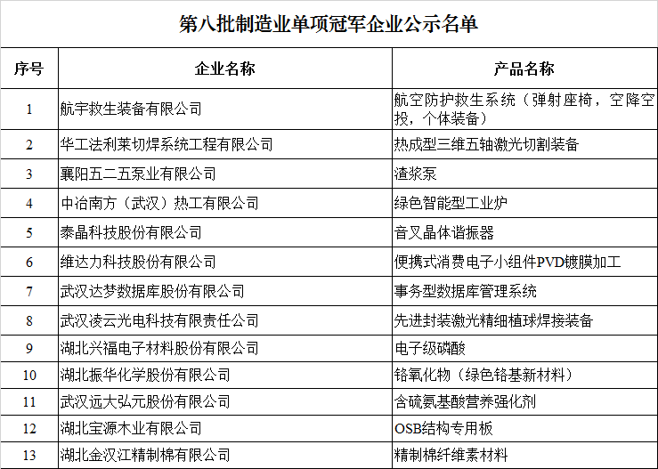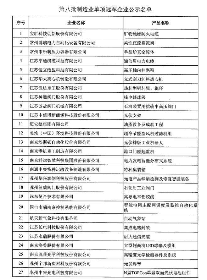 第八批制造業單項冠軍企業公示名單