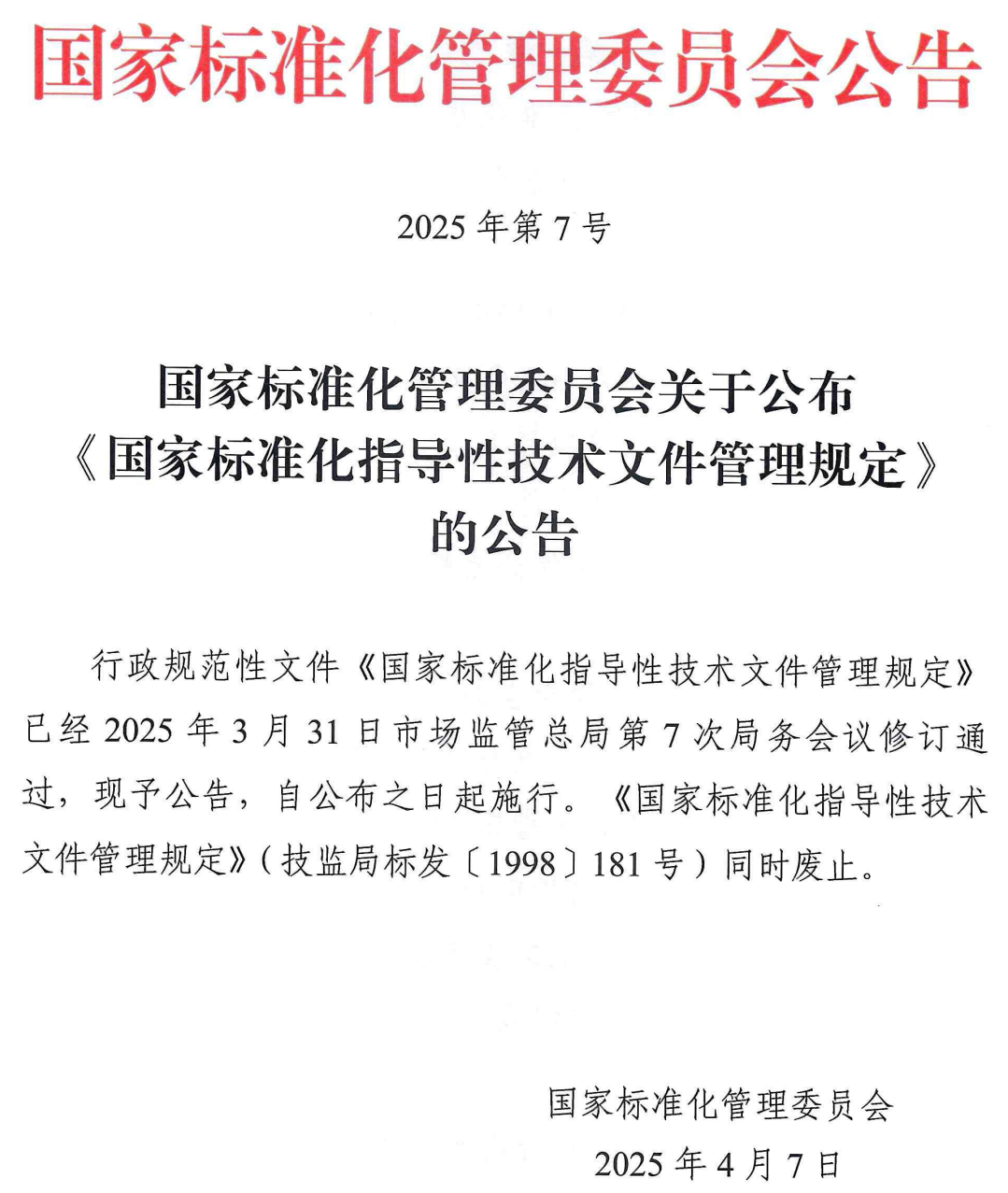 摘要:4月7日,國家標準化管理委員會修訂公布《國家標準化指導性技術文件管理規定》(以下簡稱《管理規定》),即日起施行。國家標準化指導性技術文件是適應科技創新快速發展,在相關科研成果尚不具備制定國家標準條件時,支持引導創新技術推廣試用、擴散成長的一種標準化技術文件,是國家標準的重要補充。