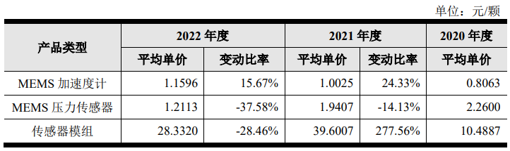 從市場的角度來看,以上產(chǎn)品中,MEMS加速度計(jì)單價(jià)呈上升趨勢,MEMS壓力傳感器和傳感器模組呈下降趨勢。該公司對單價(jià)上升的解釋為:主要系品牌客戶占比提高、產(chǎn)能緊缺背景下單價(jià)的上調(diào)所致。