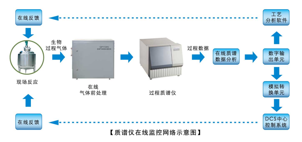 在線質(zhì)譜儀是在線、快速、多組分氣體成分高精度分析儀器,將在線質(zhì)譜儀用于生物過(guò)程領(lǐng)域,實(shí)現(xiàn)不同類(lèi)型生物過(guò)程尾氣中 O2、CO2、N2、H2、乙醇、CO、Ar等氣體及其它可揮發(fā)分子組分的高精度、寬量程和長(zhǎng)時(shí)間連續(xù)穩(wěn)定測(cè)量,得到氣體的種類(lèi)(性質(zhì))和濃度變化等信息 ,并將數(shù)據(jù)輸入軟件或者 D CS 控制系統(tǒng)進(jìn)行相關(guān)計(jì)算并實(shí)施連鎖控制。