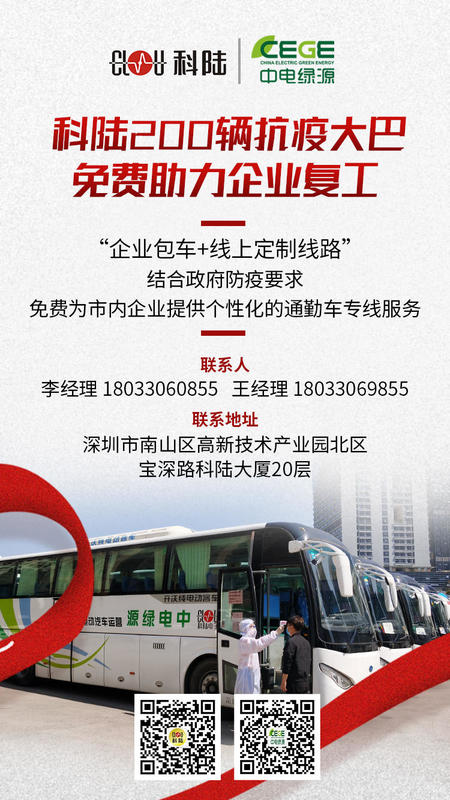 當前全國疫情防控取得積極進展,在企業復工復產過程中,員工上下班交通的交叉感染是防疫的薄弱環節。深圳市科陸電子科技股份有限公司旗下深圳市中電綠源純電動汽車運營有限公司發揮自身優勢,首批提供200輛免費抗疫大巴,為復工企業筑起安全墻。