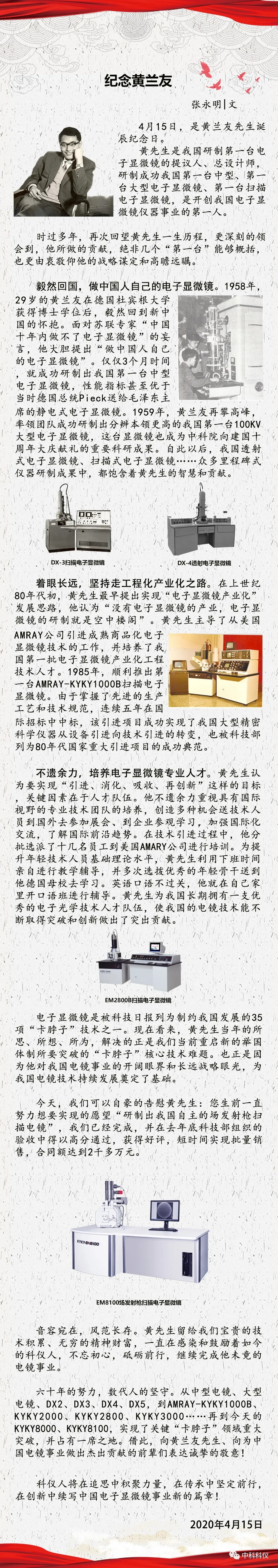 編者按:4月15日是黃蘭友先生誕辰91周年。黃先生是我國(guó)研制第一臺(tái)電子顯微鏡的提議人、總設(shè)計(jì)師,研制成功我國(guó)第一臺(tái)中型、第一臺(tái)大型電子顯微鏡、第一臺(tái)掃描電子顯微鏡,是開創(chuàng)我國(guó)電子顯微鏡儀器事業(yè)的第一人。