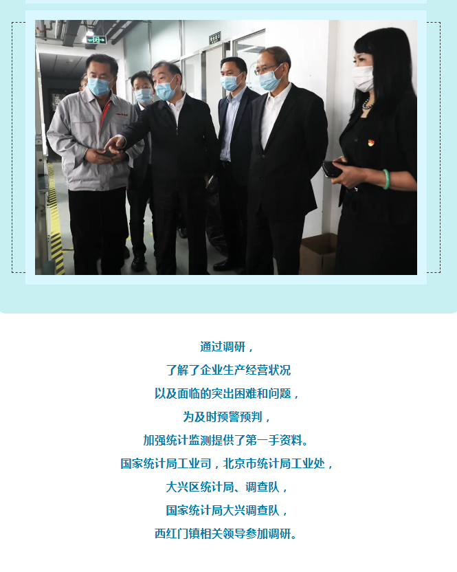為充分發揮統計部門優勢,及時客觀了解新冠疫情對小微企業的影響,進一步把脈疫情對工業經濟的影響程度,準確把握小微工業企業的需求和期待,4月15日,國家統計局黨組成員、副局長鮮祖德一行深入大興區小微工業企業一線,開展現場調研。北京市政府副秘書長王文杰、北京市統計局局長蔣力歌、國家統計局北京調查總隊總隊長徐榮華、國家統計局工業司副司長張衛華、北京市統計局副局長吳萬標、大興區常務副區長高念東陪同調研。