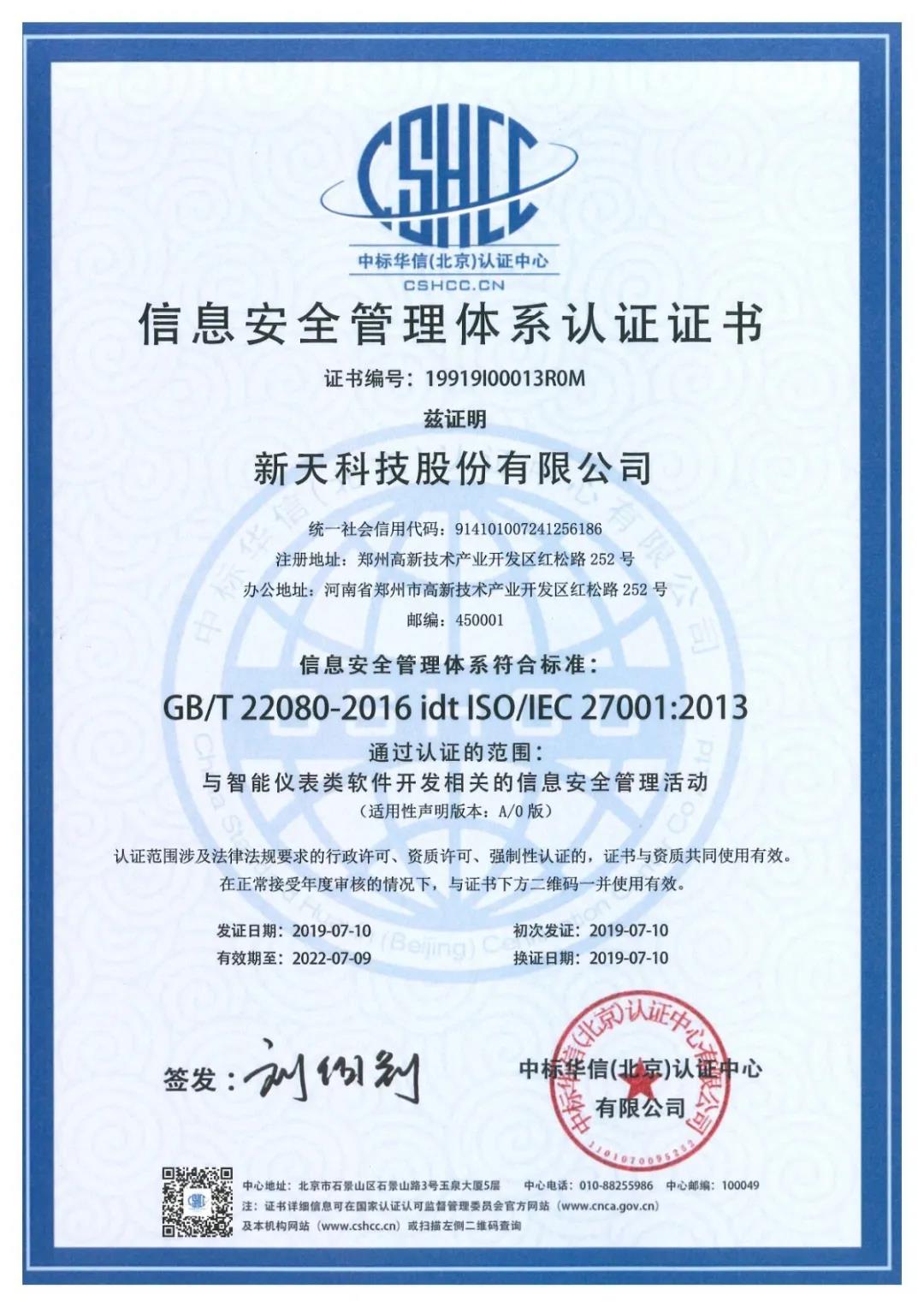 作為國內(nèi)著名的智能儀表品牌,新天科技不斷加大安全技術(shù)防范的投入,確保用戶隱私安全及運(yùn)營系統(tǒng)穩(wěn)定。通過聚焦關(guān)鍵核心技術(shù),牢牢把握自主創(chuàng)新主動權(quán),吸引培育高端人才團(tuán)隊(duì),牢筑信息安全屏障。經(jīng)過多年的實(shí)踐和優(yōu)化,新天科技已建立起一套對標(biāo)國際的安全管理體系,并在近期通過了ISO27001認(rèn)證。