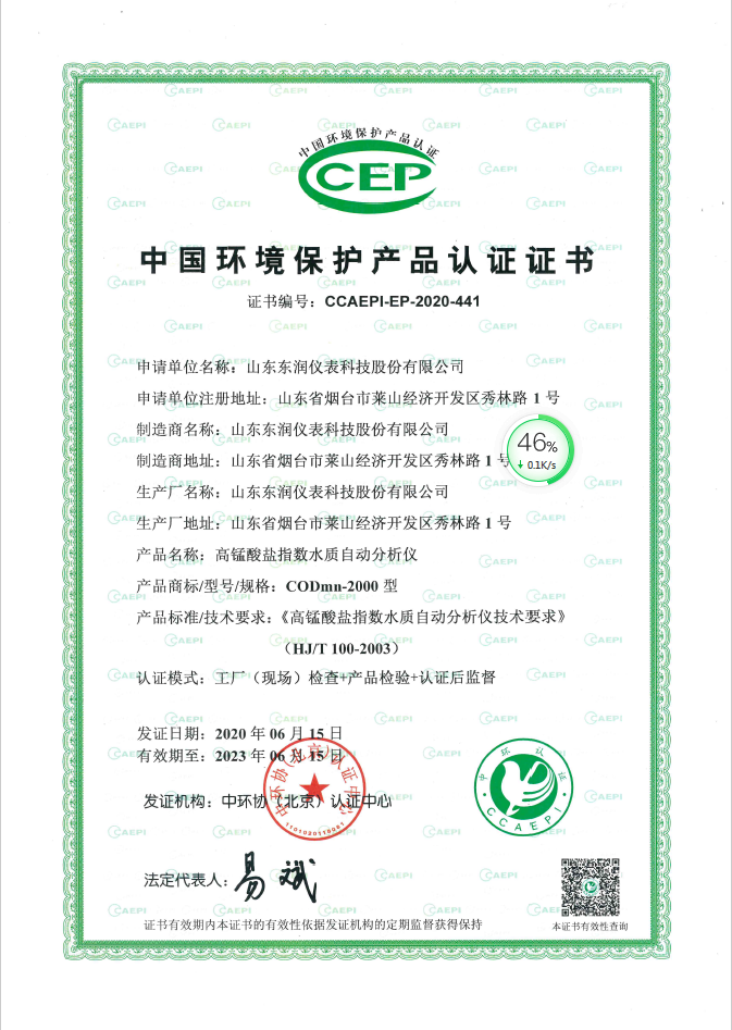 2020年6月20日山東東潤儀表科技股份有限公司通過在北京環境監測總站無故障運行3個月,喜獲CODmn-2000高錳酸鹽指數水質自動分析儀環保認證證書!