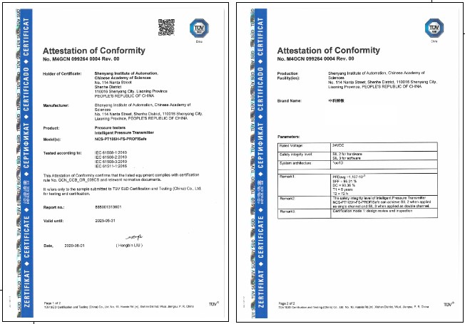 近日,中國科學(xué)院沈陽自動化研究所獲得了國際認(rèn)證機(jī)構(gòu)TüV (南德意志大中華集團(tuán))頒發(fā)的總線型智能壓力變送器SIL2/3功能安全認(rèn)證證書,這是我國首張總線型壓力變送器安全認(rèn)證證書。此前,沈陽自動化所獲得了該機(jī)構(gòu)頒發(fā)的智能溫度變送器SIL2/3功能安全認(rèn)證證書。