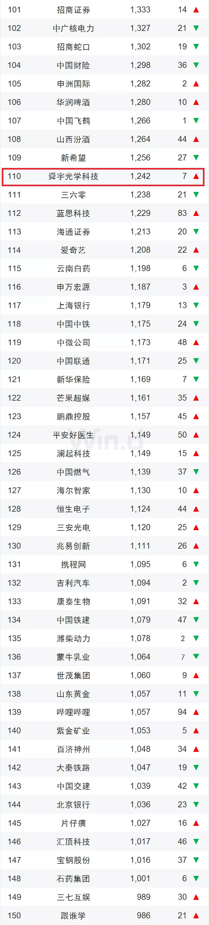中國上市企業市值500強榜單 | 舜宇位列第110