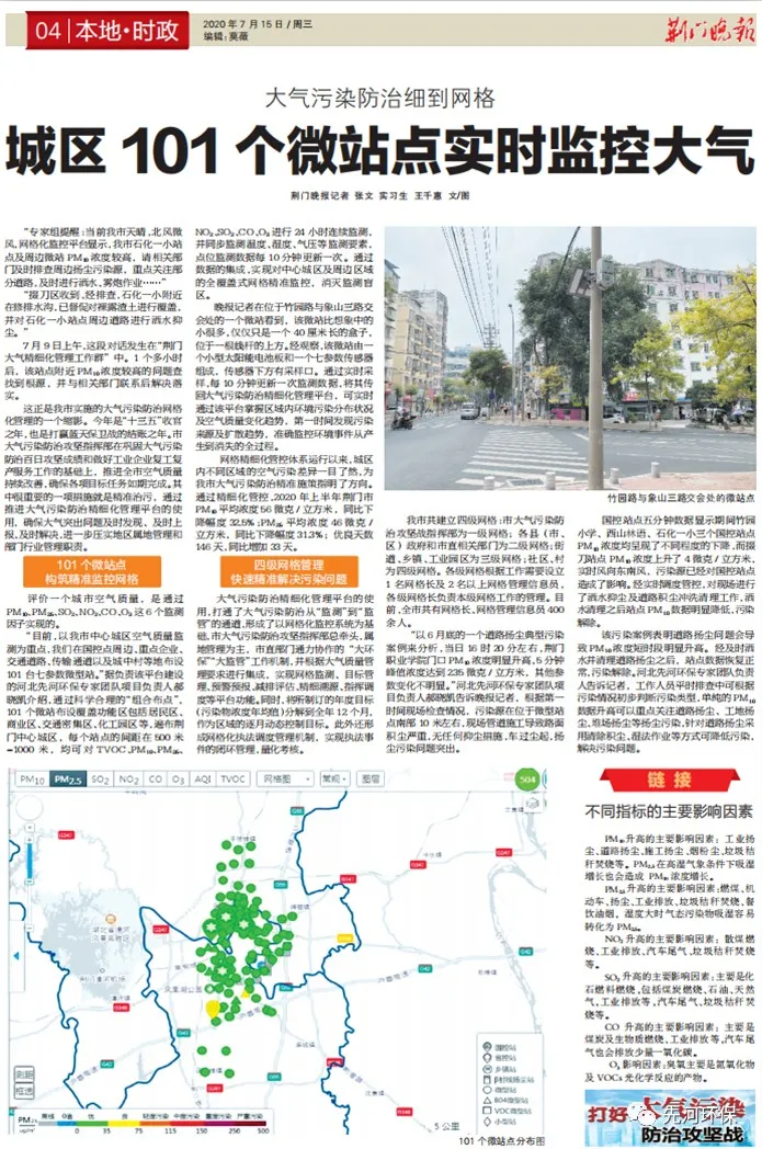 近日,《荊門晚報》以“大氣污染防治細(xì)到網(wǎng)格:城區(qū)101個微站點實時監(jiān)控大氣”為題刊發(fā)報道,為先河“大氣污染防治精細(xì)化管理平臺”點贊!