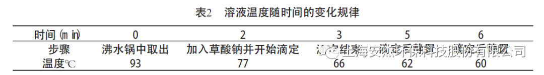 從沸水浴中取出錐形瓶時的溫度可達93℃,但加入草酸鈉溫度下降了16℃;滴定過程只用了1min, 溫度卻又下降了11℃,達到66℃。與反應(yīng)溫度下限只差6℃;滴定結(jié)束后在放置3min,溫度降至60℃。由此可見,滴定過程必須自加熱結(jié)束起快速進行,爭取在3min 內(nèi)結(jié)束滴定,不能超過6 min。