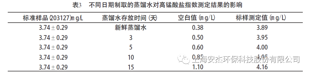 標樣測定值隨著空白值的增大而增大,當空白值為0.60 mg/ L (即蒸餾水存放時間為5 天)時,測定結(jié)果已接近不確定度的上限,而空白值超過0.85 mg/ L (即蒸餾水存放時間超過10 天)時,測定結(jié)果已超出不確定度的上限。因此,在測定高錳酸鹽指數(shù)時,不要使用存放時間超過5 天的蒸餾水,最好取用新鮮蒸餾水,這樣就可以減少空白值對測定結(jié)果的影響。