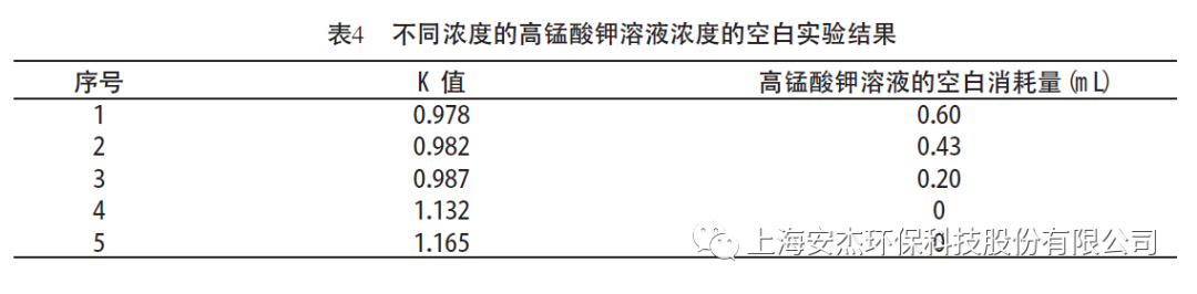 當K值較小即高錳酸鉀溶液濃度過低時,空白消耗量偏大,使測定結(jié)果偏低;當K 值較大即高錳酸鉀溶液濃度大于0.0100 mol/L時,空白消耗量為0 mL,空白實驗無法完成。所以在測定樣品前首先要將高錳酸鉀溶液濃度調(diào)至≤0.0100 mol/L,越接近理論值越好。
