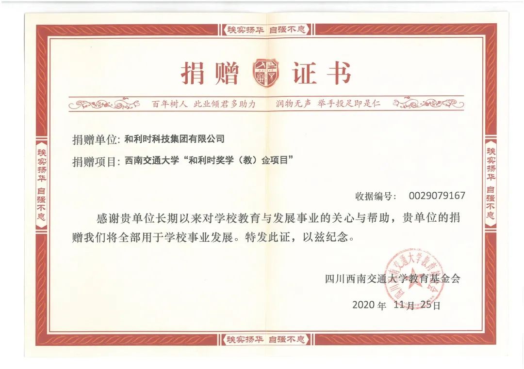為了深入開展校企合作,共建校企人才培養平臺,和利時集團策劃了青年人才引進項目設置高校獎學金計劃。西南交通大學成為軌道交通業務校企合作獎學金計劃的重點合作院校之一。2020年11月27日和利時與西南交通大學的獎學(教)金捐贈儀式順利舉行。