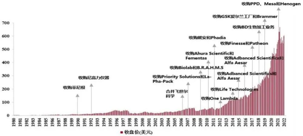 對(duì)于并購(gòu)標(biāo)的的選擇尤其偏愛細(xì)分龍頭。比如2011年以21億美元收購(gòu)美國(guó)戴安公司,成為色譜行業(yè)領(lǐng)先者;2021年,174億美元收購(gòu)PPD,躋身全球CRO行業(yè)TOP 5。