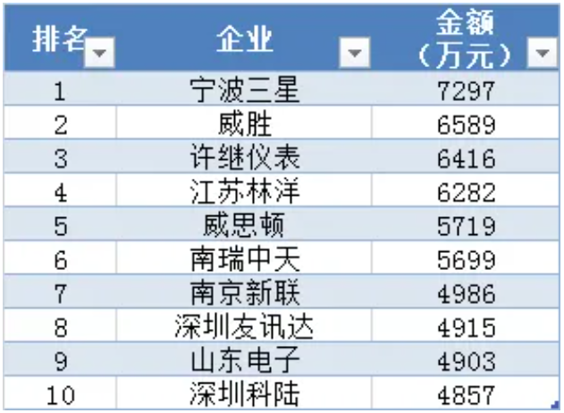 A級單相智能電能表中標金額前十企業