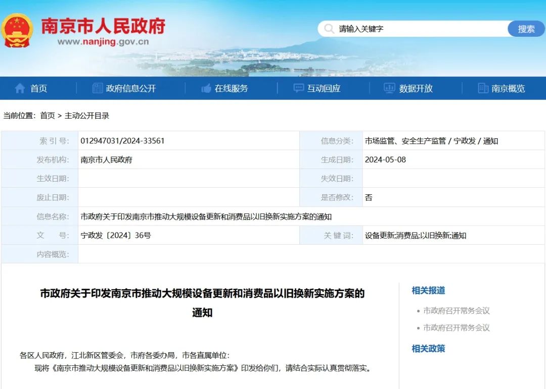 5月10日,從南京市人民政府官網獲悉,《南京市推動大規(guī)模設備更新和消費品以舊換新實施方案》已正式印發(fā)。