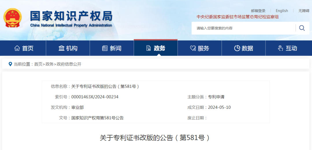 近日,國家知識產權局發布關于專利證書改版的公告(第581號),對于授權公告日在2024年6月1日之后(含當日)的專利,國家知識產權局頒發新版專利證書。新版專利證書沿用A4規格豎排版式,優化調整著錄事項布局。