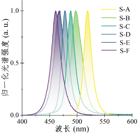 A位鹵素陰離子帶隙可控的納米晶直寫外,研究人員在BCd/Pb陽離子體系證明了該方法可以調控玻璃中局部的納米液相分離和離子交換過程,并有效的控制元素的重新分布并調控局部化學成分。通過優化脈沖持續時間、重復頻率和脈沖能量以及玻璃組分中Cd/Pb的比例,在含銫、鉛、鎘和鹵化物元素的硼硅酸鹽玻璃中實現了超快激光誘導CsPbxCd1-xBr3納米晶析出,其發光波長可調范圍為461 nm514 nm(圖2)。