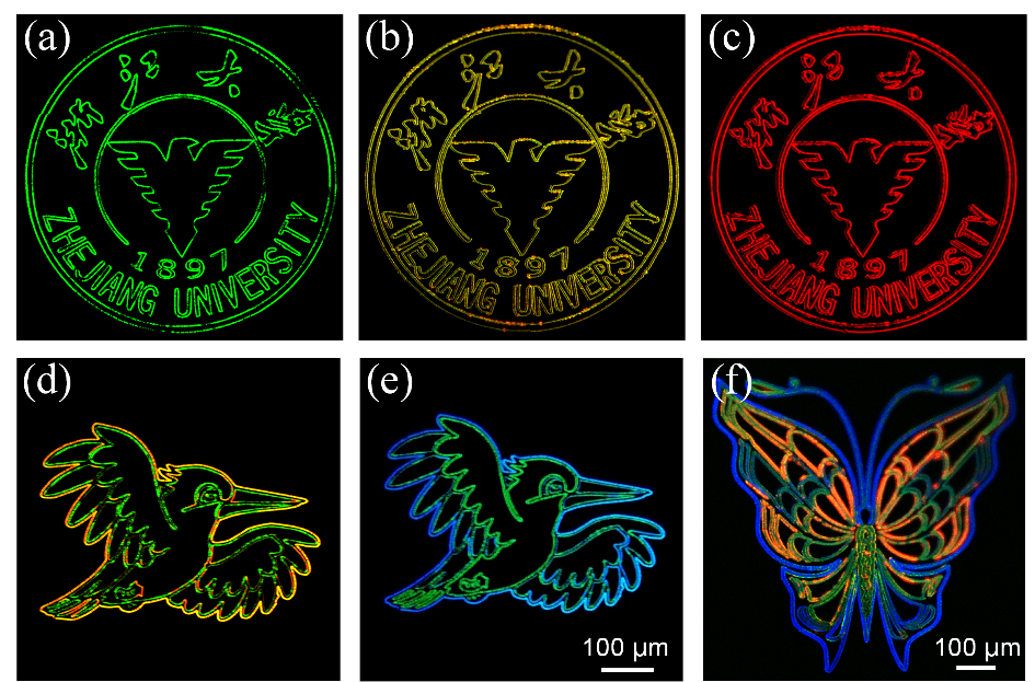 3a)~(c)在玻璃內部直寫不同顏色的浙江大學校徽,(d)~(f)納米晶彩色圖案直寫