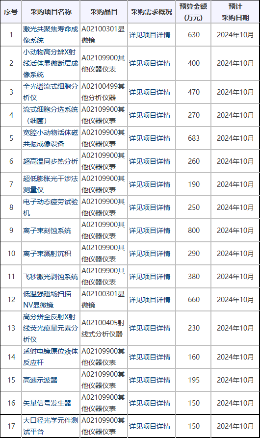 2024年9月2日,中國科學技術大學公布2024年9至12月政府采購意向清單,涉及掃描電化學顯微鏡、X射線衍射儀、疲勞試驗機、測量儀、高速示波器等多種儀器設備,預算總額超過1.6億元。