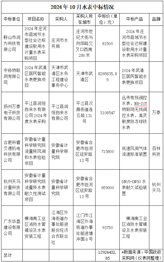 2024年10月,全國各地水表采購項目中標情況揭曉,多家企業(yè)在激烈的市場競爭中脫穎而出,成功中標各自領(lǐng)域的項目。根據(jù)中國政府采購網(wǎng)公布的數(shù)據(jù),10月水表采購總金額高達12924432.85元,涵蓋了節(jié)水型社會建設(shè)、智能水表更換、水表采購及檢驗等多個方面。