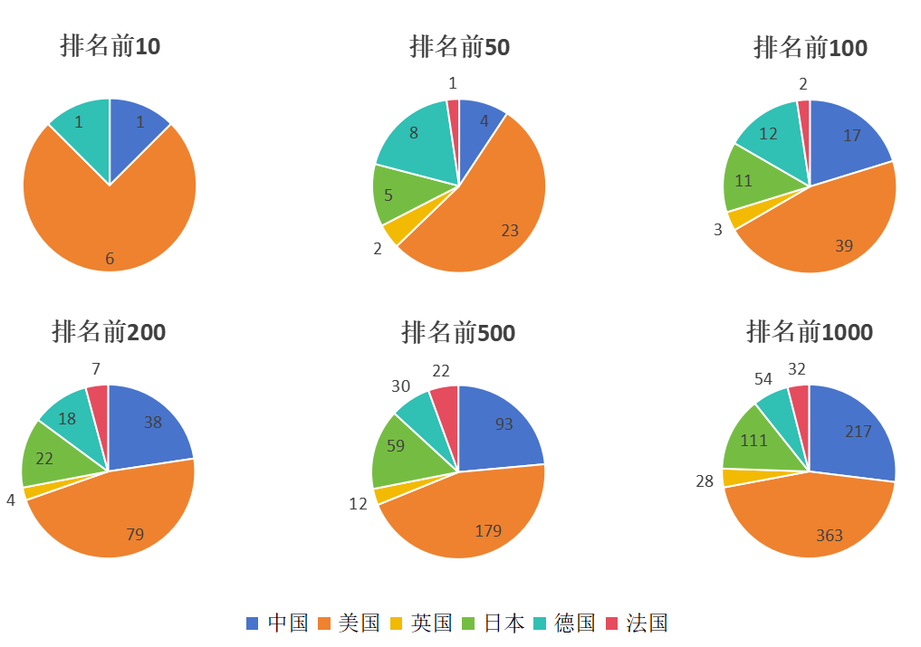 在平均研發投入總額上,中國科技領軍企業表現出了與前兩者截然相反的統計特征。在排名前10的分段中,憑借著華為這一家科技領軍企業,中國的平均研發投入水平占據了約三分之一的比例,略遜于美國。而隨著分段的逐漸向后擴大,中國科技領軍企業所占比例逐漸下降,在排名前1000的分段中其所占比例甚至位于六國之末。