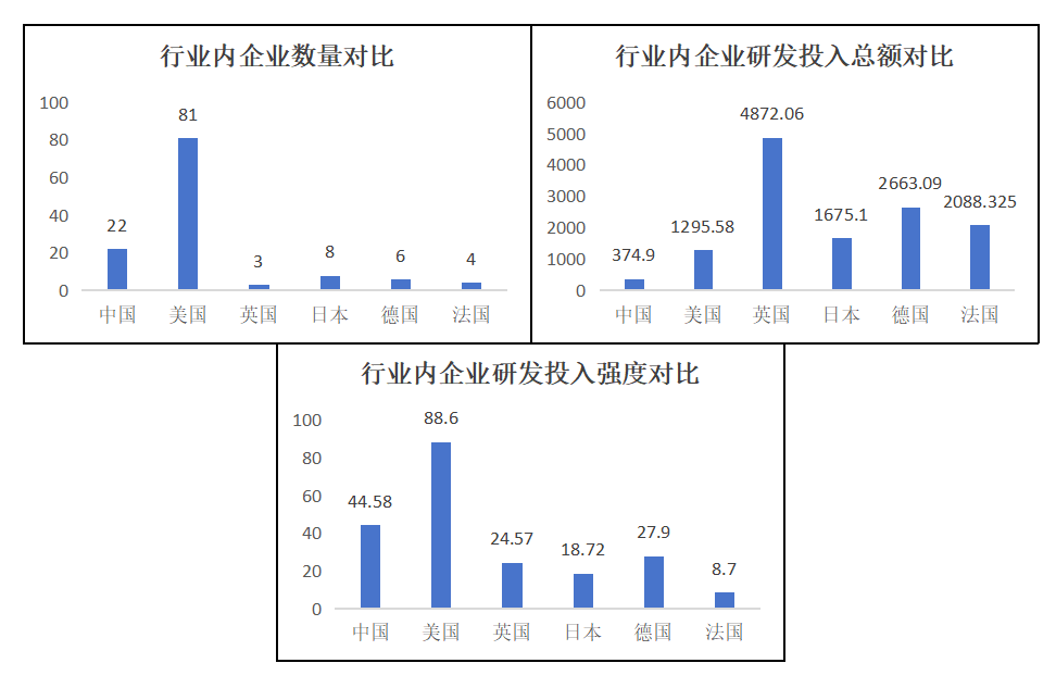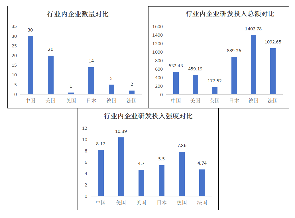 四是汽車和零部件行業上,中國科技領軍企業的數量優勢并不明顯;其平均研發投入總額僅略高于英國,處于較低的水平;其平均研發投入強度則大約處于中等偏上的水平。總之,中國科技領軍企業在汽車和零部件行業上的發展比較一般,體量優勢不明顯,創新水平不高;在平均研發投入總額較低的情況下卻有著較高的平均研發投入強度,更是說明了我國汽車和零部件行業的營收情況不容樂觀。