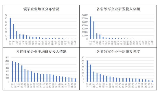 對我國內陸各省市科技領軍企業數量、研發投入總額、平均研發投入總額以及平均研發投入強度進行比較,得到的結果如圖11所示。