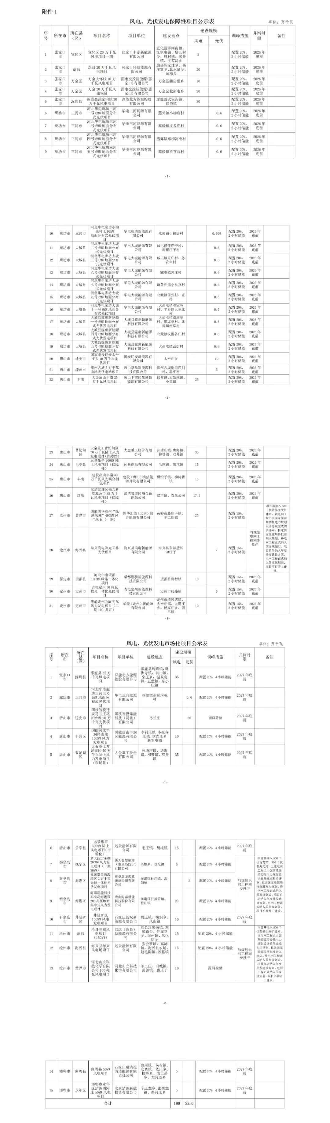 第三批:47個,4.85GW第三批擬公示項目共47個、總規(guī)模485.499萬千瓦,其中保障性項目共32個、282.899萬千瓦,市場化項目共15個、202.6萬千瓦。根據(jù)項目單位來看,獲得項目指標最多的企業(yè)為大金重工,規(guī)模為95萬千瓦;其次是深圳能源,規(guī)模為65萬千瓦;隨后是遠景能源,規(guī)模為45萬千瓦。這3家企業(yè)項目均為風電項目。從風電、光伏項目區(qū)域分布來看,唐山市獲得項目容量最多,為202.5萬千瓦,其次是張家口市,規(guī)模為120萬千瓦,然后是滄州市,規(guī)模為72萬千瓦。