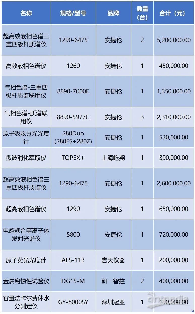烏魯木齊海關近日再次發布關于海關實驗室儀器設備更新項目中標公告,本次采購的16臺設備涉及超高效液相色譜三重四級桿質譜儀、氣相色譜-三重四級桿質譜聯用儀、電感耦合等離子體發射光譜儀等一批分析測試設備,安捷倫、上海屹堯、吉天儀器等品牌中標,其中安捷倫占據11臺。