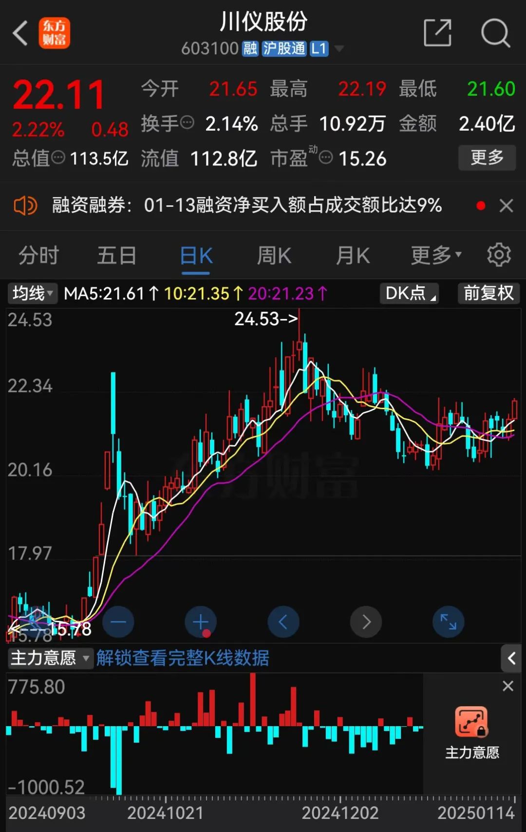 1月14日收盤(pán),川儀股份股價(jià)報(bào)22.11元/股,漲幅為2.22%,總市值為113.5億元。