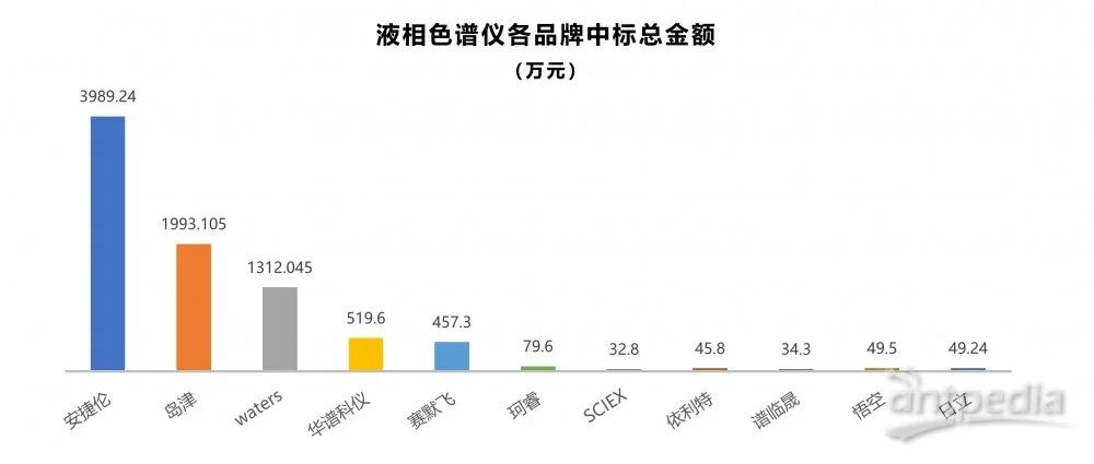 從總金額來看,安捷倫以3989.24萬元位居首位,占整體中標金額的47.6%;島津(1993.105萬元)、Waters(1312.045萬元)、華譜科儀(519.6萬元)和賽默飛(457.3萬元)分列二至五位。值得一提的是華譜科儀,其以中標總金額519.6萬元排名第四,在本次海關設備更新的液相色譜招標中,堪稱一匹黑馬。