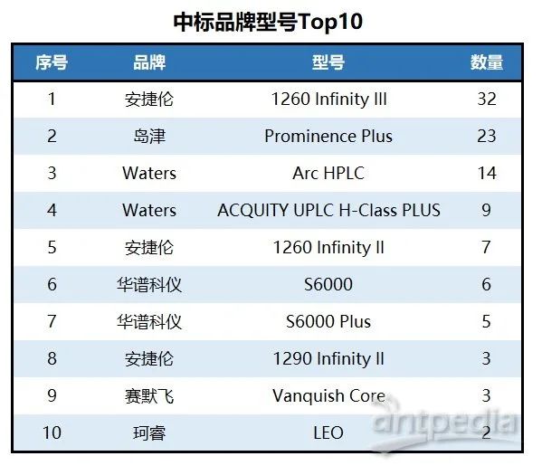根據此次中標結果,分析測試百科網梳理出品牌熱門型號 Top10。從中標型號分布來看,安捷倫憑借1260系列(含Infinity III、Infinity II)全面領跑市場,其中1260 Infinity III以32臺(套)的絕對優勢獨占鰲頭,憑借高精度、高穩定性和廣泛的應用場景,贏得了海關單位的青睞。島津Prominence Plus系列和Waters的Arc HPLC與ACQUITY UPLC H-Class PLUS分別位列二、三、四位。國內品牌中,華譜科儀的S6000和S6000 Plus與珂睿的LEO成為唯二上榜的國產代表型號。整體而言,國際品牌的多種型號依舊主導市場,國產設備在技術適配性和應用場景拓展方面,仍有較大的提升空間。