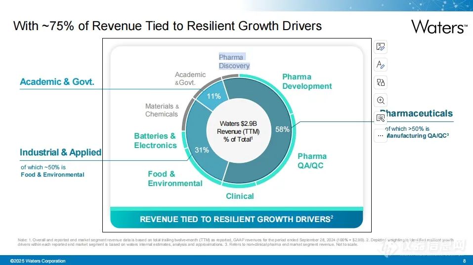 Batra指出,Waters專注于監(jiān)管嚴(yán)格且需求尚未被充分滿足的市場(chǎng),市場(chǎng)總體規(guī)模約為120億美元,并以中個(gè)位數(shù)的速度穩(wěn)定增長(zhǎng)。在生命科學(xué)領(lǐng)域,制藥行業(yè)的長(zhǎng)期增速約為高個(gè)位數(shù),主要得益于新型治療方法和生物制劑的推動(dòng);而臨床領(lǐng)域同樣以高個(gè)位數(shù)增長(zhǎng),重點(diǎn)聚焦特定臨床細(xì)分市場(chǎng),尤其是質(zhì)譜技術(shù)在早期疾病檢測(cè)和小分子分析中的應(yīng)用。此外,在工業(yè)與應(yīng)用領(lǐng)域(包括食品和環(huán)境市場(chǎng)),增長(zhǎng)率約為中個(gè)位數(shù),受全球人口增長(zhǎng)以及對(duì)安全食品和清潔水源需求的推動(dòng);同時(shí),PFAS(全氟和多氟化合物)檢測(cè)需求及減少食品和環(huán)境中雜質(zhì)的趨勢(shì)也帶來(lái)了新的增長(zhǎng)機(jī)遇。材料領(lǐng)域的增速為中個(gè)位數(shù),近期受經(jīng)濟(jì)電氣化進(jìn)程加速的推動(dòng),尤其是電動(dòng)車需求的增加表現(xiàn)出更強(qiáng)勁的增長(zhǎng)。而學(xué)術(shù)與政府領(lǐng)域作為最小的終端市場(chǎng),其長(zhǎng)期增速為低個(gè)位數(shù),主要依賴政府撥款支持。