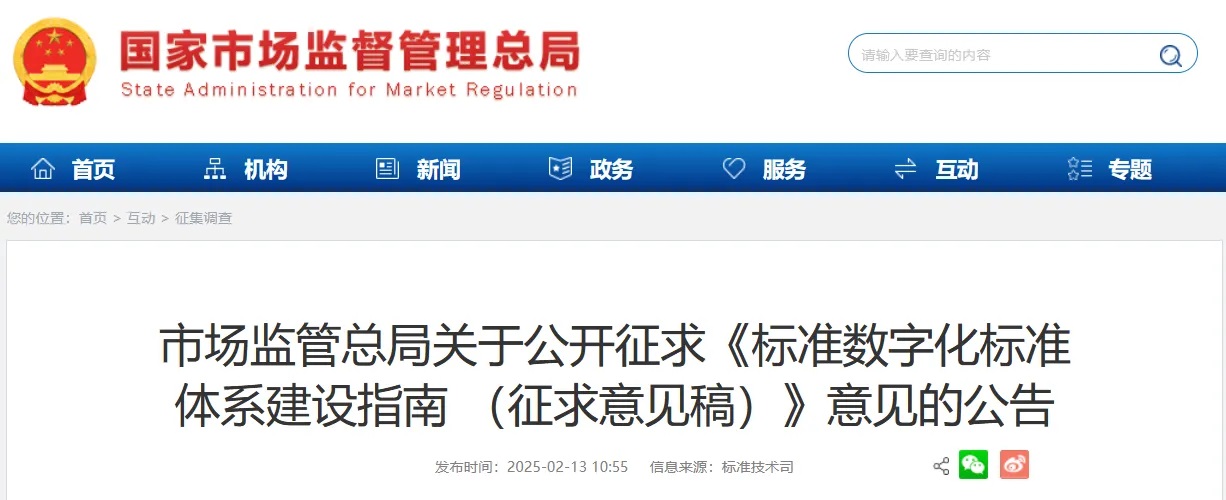 為深入貫徹落實黨中央、國務(wù)院關(guān)于推動標(biāo)準(zhǔn)化工作向數(shù)字化、網(wǎng)絡(luò)化、智能化轉(zhuǎn)型的決策部署,實施《國家標(biāo)準(zhǔn)化發(fā)展綱要》和《質(zhì)量強國建設(shè)綱要》,充分發(fā)揮標(biāo)準(zhǔn)的基礎(chǔ)性、引領(lǐng)性作用,加快構(gòu)建結(jié)構(gòu)合理、層次分明、適應(yīng)經(jīng)濟(jì)社會高質(zhì)量發(fā)展的標(biāo)準(zhǔn)數(shù)字化標(biāo)準(zhǔn)體系。市場監(jiān)管總局起草了《標(biāo)準(zhǔn)數(shù)字化標(biāo)準(zhǔn)體系建設(shè)指南 (征求意見稿)》,現(xiàn)向社會公開征求意見,意見反饋截止日期為2025年3月12日。公眾可以通過以下途徑和方式提出意見:
