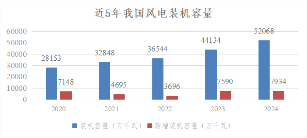 截至2024年末,全國風(fēng)電累計(jì)并網(wǎng)容量達(dá)到5.21億千瓦,同比增長18%,其中陸上風(fēng)電4.8億千瓦,海上風(fēng)電4127萬千瓦,在全國電力裝機(jī)中排在第3位。全年新增裝機(jī)容量7982萬千瓦,同比增長6%,其中陸上風(fēng)電7579萬千瓦,海上風(fēng)電404萬千瓦。從新增裝機(jī)分布看,“三北”地區(qū)占全國新增裝機(jī)的75%。2024年,全國風(fēng)電發(fā)電量9916億千瓦時(shí),同比增長16%,僅次于火電和水電,排在第3位;全年并網(wǎng)發(fā)電利用小時(shí)數(shù)為2127小時(shí),平均上網(wǎng)利用率95.9%。