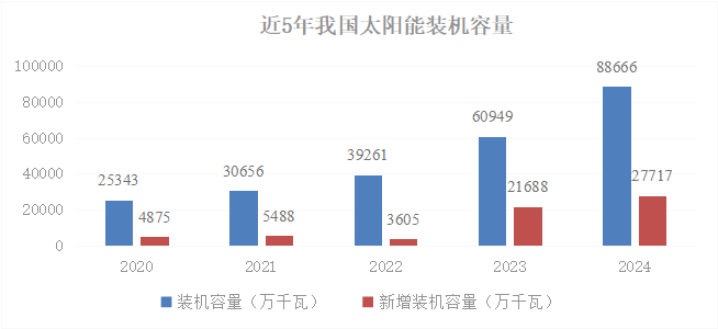 截至2024年末,全國光伏發(fā)電裝機(jī)容量達(dá)8.86億千瓦,同比增長45%,排在火電之后,位居第2位,其中集中式光伏5.11億千瓦,分布式光伏3.75億千瓦。全年光伏新增裝機(jī)2.78億千瓦,同比增長28%,其中集中式光伏1.59億千瓦,分布式光伏1.18億千瓦。全年光伏發(fā)電量達(dá)到8341億千瓦時(shí),同比增長44%,但仍落后于核電的發(fā)電量,排在第5位。全年發(fā)電利用小時(shí)數(shù)為1211小時(shí),發(fā)電上網(wǎng)利用率96.8%,較上年有所降低。