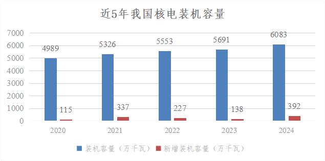 2024年是我國核電發(fā)展具有里程碑的一年,全年新核準(zhǔn)11臺(tái)核電機(jī)組,為歷年核準(zhǔn)數(shù)量之最,連續(xù)3年核準(zhǔn)機(jī)組數(shù)量超過10臺(tái);投入運(yùn)行核電機(jī)組2臺(tái),新增額定裝機(jī)規(guī)模240萬千瓦;在運(yùn)、在建和核準(zhǔn)待建核電機(jī)組共有102臺(tái),總裝機(jī)容量1.13億千瓦,連續(xù)2年位居全球首位。截至當(dāng)年末,全國運(yùn)行核電機(jī)組共有57臺(tái)(不含臺(tái)灣地區(qū)),額定裝機(jī)容量為5943.17萬千瓦。全年累計(jì)核電發(fā)電量為4451.75億千瓦時(shí),比上年同期上升了2.72%,占全國累計(jì)發(fā)電量的4.73%,超過太陽能發(fā)電量,排在第4位。由此可見,我國核電裝機(jī)占全國總裝機(jī)的比例不到2%,但發(fā)出的電量接近全國總發(fā)電量的5%。年設(shè)備利用小時(shí)數(shù)為7805.74小時(shí),平均機(jī)組能力因子為90.26%。