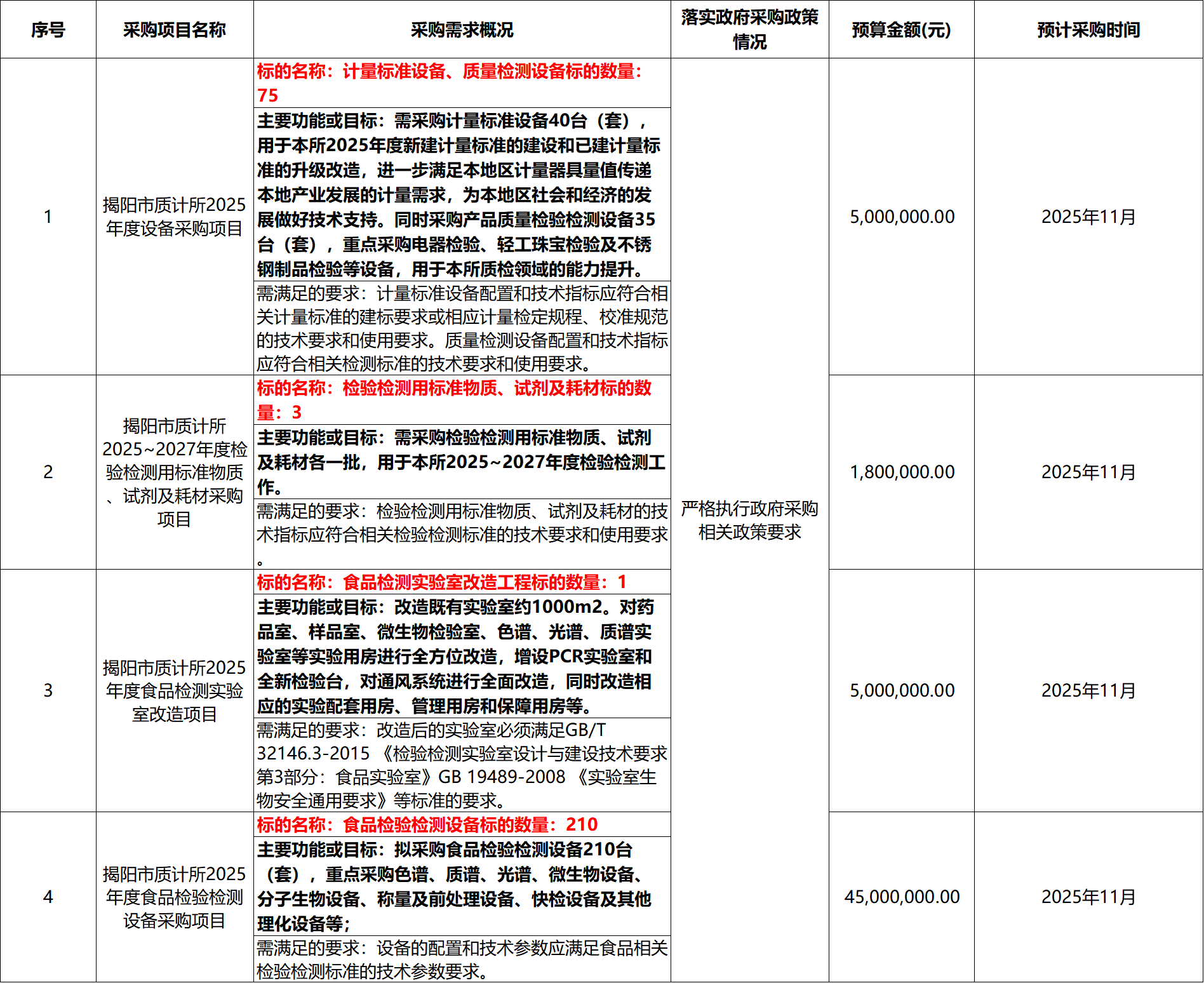 4 月 22 日,廣東省揭陽市質(zhì)量計量監(jiān)督檢測所就 2025 年 04 月至 2025 年 11 月政府采購意向連續(xù)發(fā)布 4 個公告。公告顯示,在 11 月份,揭陽質(zhì)量計量監(jiān)督所將著重采購色譜、質(zhì)譜、光譜、微生物設備、分子生物設備、稱量及前處理設備、快檢設備及其他理化設備等 210 臺儀器用于食品檢驗檢測;采購相關(guān)檢驗檢測用標準物質(zhì)、試劑及耗材 3 批;采購計量標準設備 40 臺(套);采購產(chǎn)品質(zhì)量檢驗檢測設備 35 臺(套)。