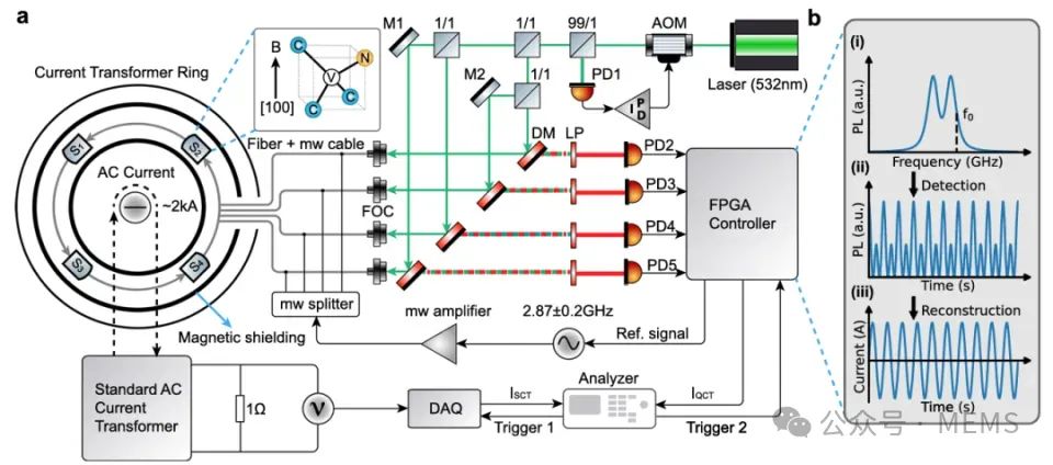 孫方穩(wěn)團(tuán)隊(duì)長(zhǎng)期開展金剛石量子傳感器件的加工制備研究,攻克了系列關(guān)鍵技術(shù)。為了解決電流測(cè)量難題,此次研究中團(tuán)隊(duì)采用光纖-金剛石傳感器進(jìn)行高壓電流測(cè)量,四個(gè)集成化金剛石量子傳感器均勻分布在磁屏蔽環(huán)中,其[100]晶向與交流磁場(chǎng)平行以提高信噪比。研究提出了在零偏置磁場(chǎng)下對(duì)熒光信號(hào)進(jìn)行倍頻轉(zhuǎn)換和加權(quán)平均的處理方法,該方法能夠重構(gòu)50赫茲交流電的波形;同時(shí),為了拓寬電流測(cè)量動(dòng)態(tài)范圍,采用共振頻率跟蹤方法,保持金剛石傳感器對(duì)不同大小電流導(dǎo)致磁場(chǎng)變化的敏感性;針對(duì)實(shí)際應(yīng)用中系統(tǒng)溫度變化影響測(cè)量精度的問(wèn)題,通過(guò)雙頻量子控制方法可抑制溫度漂移;最后在0至1000安培范圍內(nèi)進(jìn)行電流測(cè)量,將測(cè)量結(jié)果與標(biāo)準(zhǔn)電流互感器進(jìn)行對(duì)比,實(shí)現(xiàn)了0.05%的測(cè)量精度。