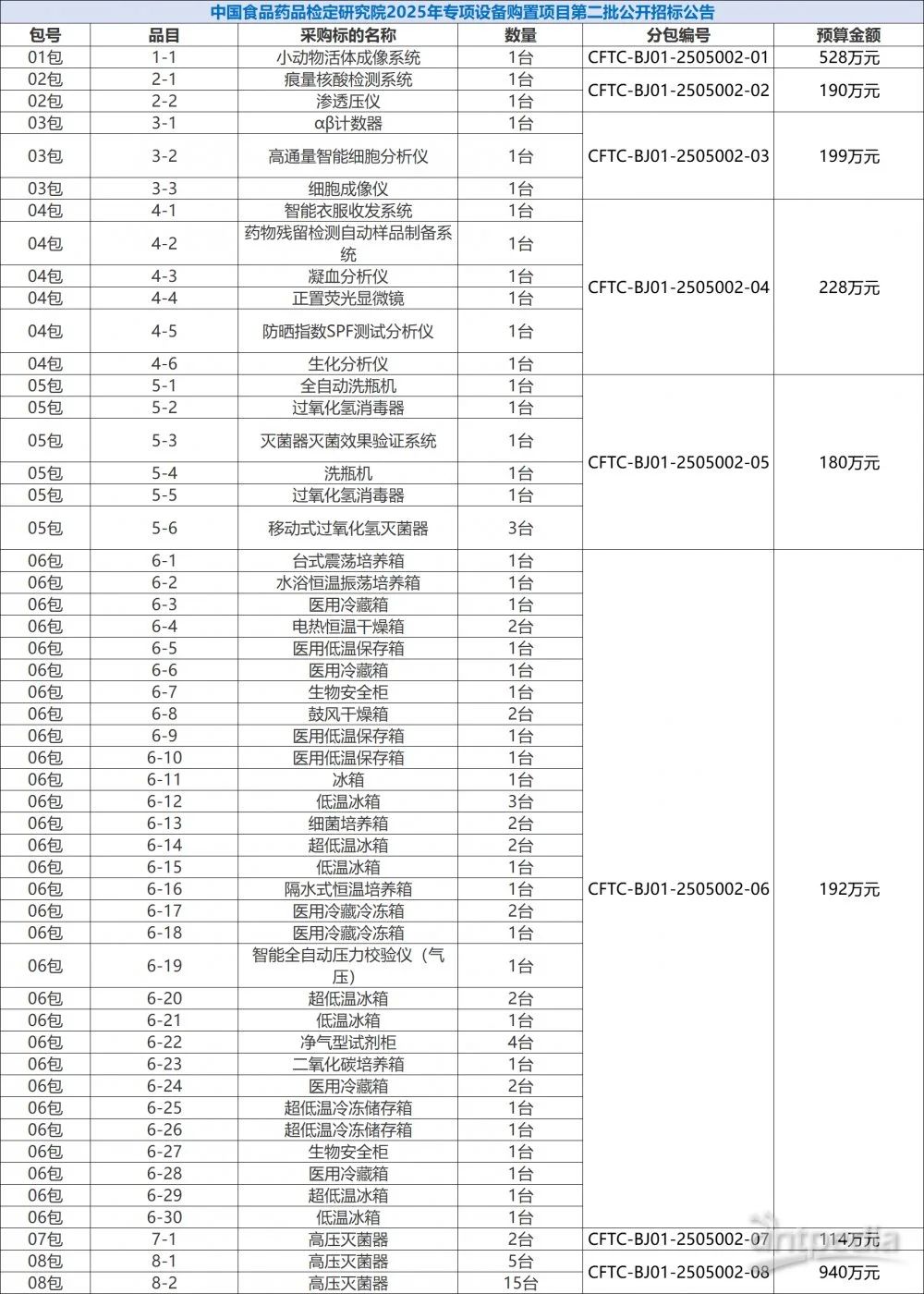 據悉,中國食品藥品檢定研究院作為國家檢驗藥品生物制品質量的法定機構和最高技術仲裁機構,在保障食品藥品安全方面責任重大。此次大規模設備購置,將進一步提升其檢驗檢測能力,為藥品、化妝品、醫療器械等領域的質量把控和安全監管提供更有力的技術支撐,有助于推動相關行業高質量發展,更好地守護公眾健康。