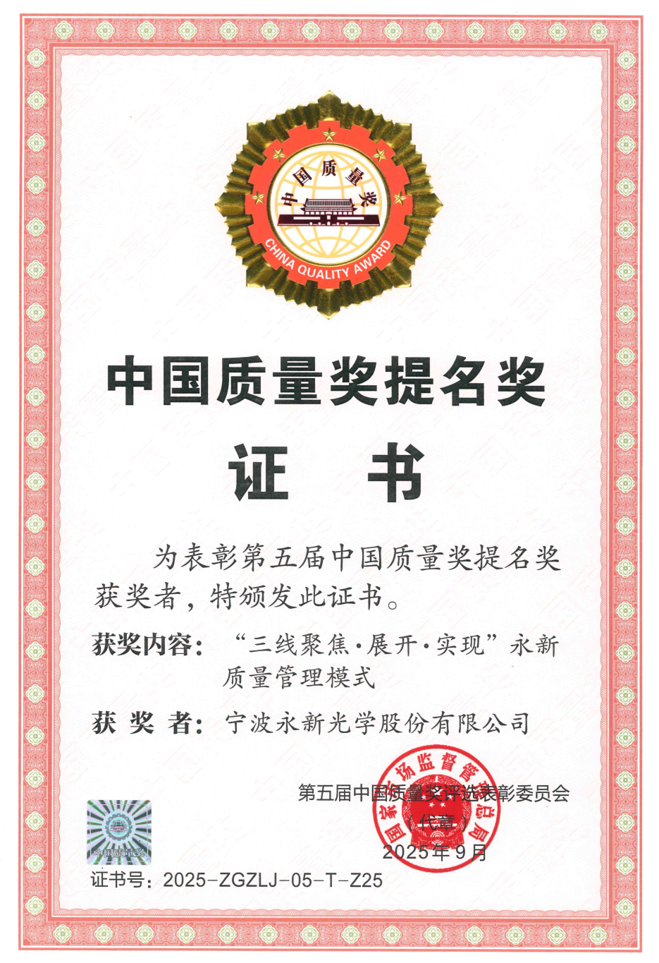 9 月 16 日,在南京舉行的中國質量大會上,永新光學榮獲第五屆“中國質量獎提名獎”。國務院副總理張國清出席開幕式并致辭,強調要深入貫徹習近平總書記重要指示精神,全面落實黨中央、國務院決策部署,深入實施質量強國戰略,持續提升質量治理效能,更好服務高質量發展和人民群眾高品質生活。此次獲獎,是永新光學繼2023年獲得第九屆浙江省人民政府質量獎之后,在質量領域再獲的一項國家級重要榮譽。