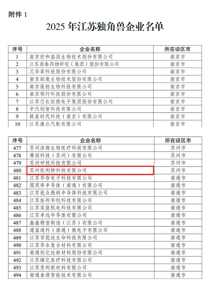 近日,江蘇省新質生產力促進中心正式發布《關于發布 2025 年江蘇獨角獸企業評估結果的通知》,經過嚴格遴選與專業評估,蘇州依利特科技有限公司憑借在技術創新、產業潛力與高質量發展貢獻方面的突出表現,成功榮登 2025 年江蘇獨角獸企業名單,成為江蘇省高成長企業群體中的代表之一。