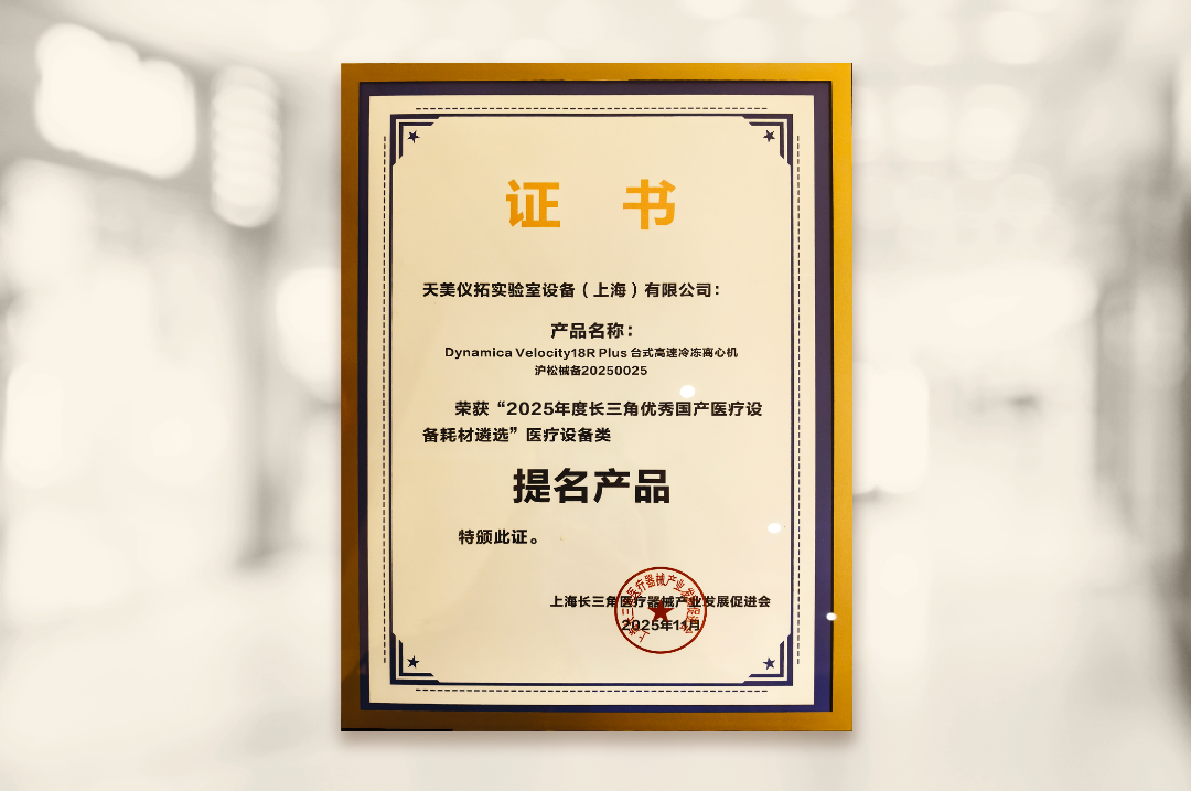 天美旗下Dynamica Velocity18R Plus臺式高速冷凍離心機從眾多國產設備中脫穎而出,榮獲“2025年度長三角優秀國產醫療設備耗材遴選”醫療設備類提名產品。
