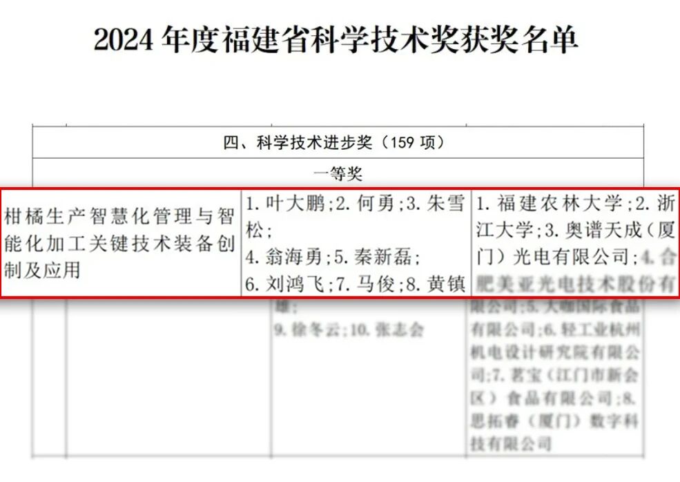 近日,奧譜天成憑借《基于高光譜多譜融合技術(shù)的柑橘生長(zhǎng)全周期與品質(zhì)檢測(cè)系統(tǒng)》榮獲福建省科技進(jìn)步一等獎(jiǎng)。該獎(jiǎng)項(xiàng)由福建省人民政府設(shè)立,是省內(nèi)最高級(jí)別的科技榮譽(yù)之一,重點(diǎn)表彰在技術(shù)創(chuàng)新、工程應(yīng)用及行業(yè)貢獻(xiàn)方面取得突出成果的單位。本次獲獎(jiǎng)不僅體現(xiàn)了該項(xiàng)目在關(guān)鍵技術(shù)上的創(chuàng)新突破,也標(biāo)志著奧譜天成在農(nóng)業(yè)智能檢測(cè)裝備領(lǐng)域的領(lǐng)先實(shí)力得到權(quán)威認(rèn)可。