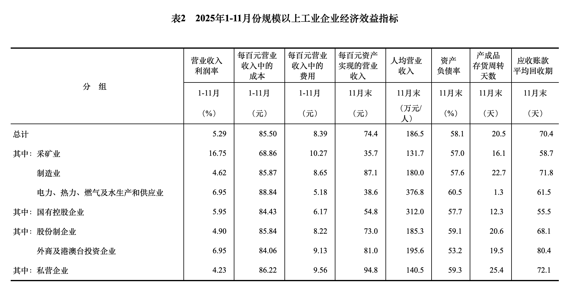 11月末,規模以上工業企業資產總計189.28萬億元,同比增長4.8%;負債合計109.96萬億元,增長5.0%;所有者權益合計79.32萬億元,增長4.5%;資產負債率為58.1%,同比上升0.1個百分點。