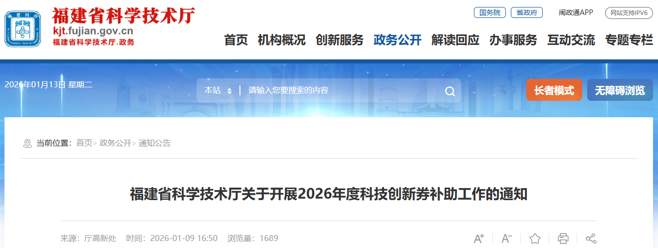 福建省科學(xué)技術(shù)廳關(guān)于開展2026年度科技創(chuàng)新券補(bǔ)助工作的通知